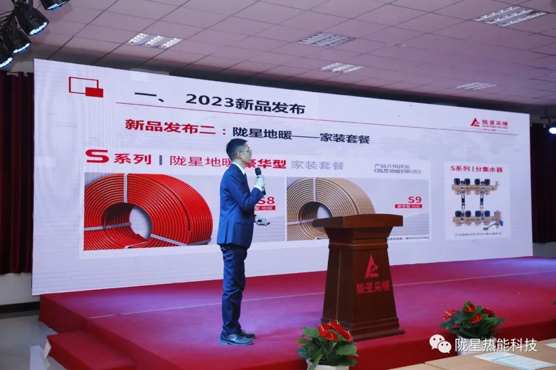 下午4:00,隴星熱能科技公司副總經(jīng)理、銷售公司總經(jīng)理劉靜先生代表公司在經(jīng)銷商年會(huì)上發(fā)布了公司2023年地暖、電暖器、散熱器等新產(chǎn)品,重點(diǎn)介紹了隴星地暖PERT五層阻氧管全新上市、隴星地暖豪華型家裝套餐S8系列與S9系列、隴星地暖舒適型家裝套餐A6系列與A7系列,以及隴星地暖一站式6包服務(wù)、隴星地暖工程專供產(chǎn)品等,工廠產(chǎn)品不斷推陳出新,為經(jīng)銷商朋友創(chuàng)造了新的商機(jī)。